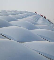 一談到幕墻,大家首先想到的是玻璃,鋁合金,石材等各種硬質(zhì)材料的建筑幕墻應(yīng)用形式。而柔性膜結(jié)構(gòu)幕墻的應(yīng)用依賴于膜結(jié)構(gòu)及膜材的技術(shù)創(chuàng)新和發(fā)展,從歷史上來(lái)看,材料技術(shù)的累積為建筑學(xué)帶來(lái)越來(lái)越多的創(chuàng)意。