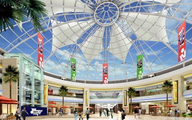 商業(yè)街的主要特點(diǎn)是因商業(yè)店鋪的集中而形成了室內(nèi)室外購物、休閑、餐飲等功能空間,步行街及中央活動(dòng)區(qū)域是人們行走、休息、交流的開放空間,基于商業(yè)街特色,就決定了所有設(shè)計(jì)的核心就是讓空間更具人性化。中庭天蓬作為建筑附加設(shè)施,不僅要求遮陽避雨的實(shí)用功能,也應(yīng)該是錦上添花的附件。膜結(jié)構(gòu)發(fā)展數(shù)年來,應(yīng)用于商業(yè)設(shè)施方面的工程案例在國內(nèi)已屢見不鮮,膜結(jié)構(gòu)建造的天棚簡(jiǎn)潔而大氣、柔美而剛勁、讓人們?cè)谛蓍e娛樂之時(shí)更加愜意。