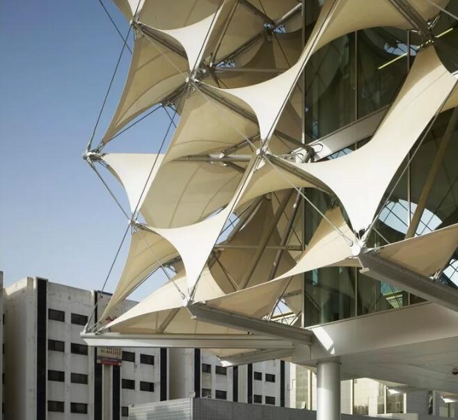 立面的外表皮是由長菱形的織物材料組成,這些白色薄膜通過立體的帶拉伸力的鋼絲繩結(jié)構(gòu)支撐起來,即張拉膜結(jié)構(gòu),不但具有遮陽的功能,而且用一種新的現(xiàn)代科技的方式重新詮釋了阿拉伯帳篷結(jié)構(gòu)的傳統(tǒng)。這個(gè)古代文化與現(xiàn)代技術(shù)交相融合后產(chǎn)生的獨(dú)特造型,形成了一個(gè)渾然一體的且有威望感的建筑外觀。夜晚,建筑物的立面會閃爍出不斷變化著的不同顏色的光,成為這個(gè)城市的一座文化燈塔。