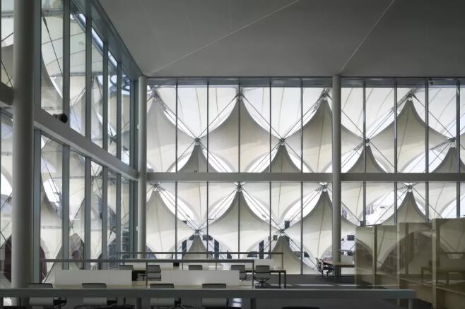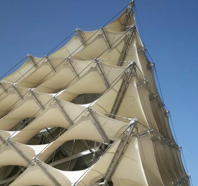 在這些金銀色絲織物的鋼絲繩結(jié)構(gòu)中,雖然太陽能的普及水平只有百分之七,但也保證了建筑物的內(nèi)外視線通透。在室外溫度超過50攝氏度的情況下,這個(gè)薄膜層通過立體的布局,將最優(yōu)化的折射光照入室內(nèi),保持了室內(nèi)舒適的溫度和光照環(huán)境。