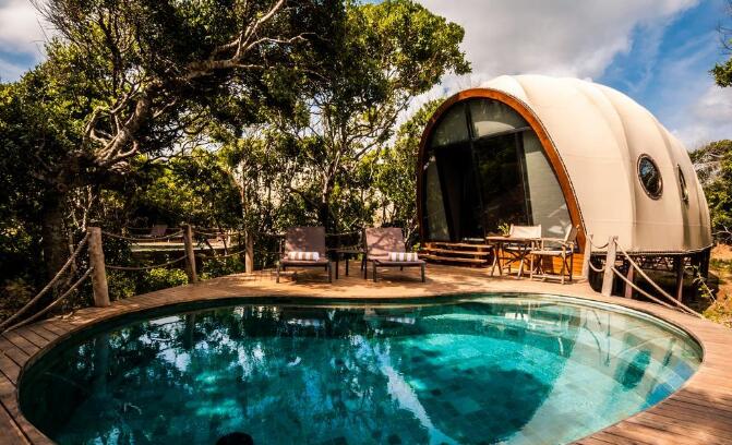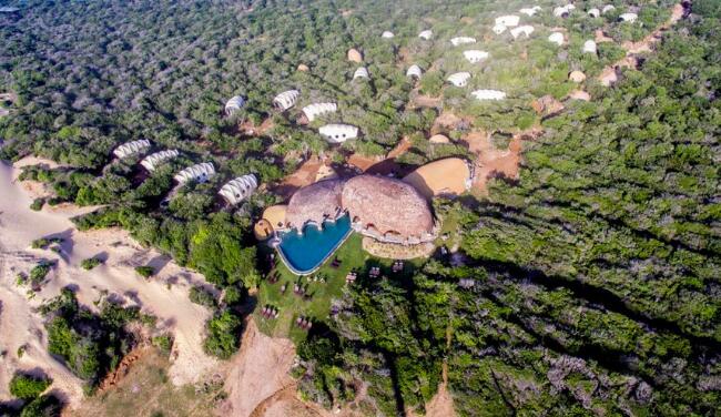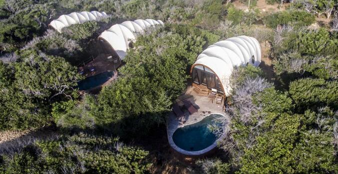 從空中俯瞰,36座繭狀的張拉膜帳篷散落在安靜的原始叢林中,為壯觀山海交界的森林盡頭增添了些許神秘和奢華的氣息。