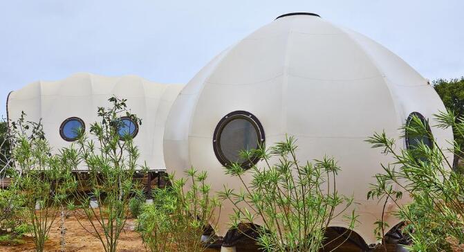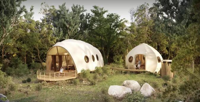 營地的主體建筑如同巨石般的亭子在場地的兩端有機(jī)地聚集在一起。大型開放的開口與較小的封閉圓頂相交,使空間更私人化。