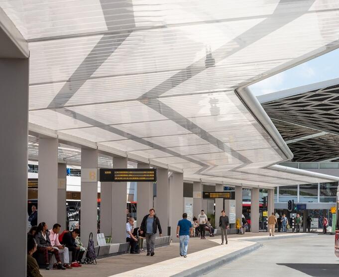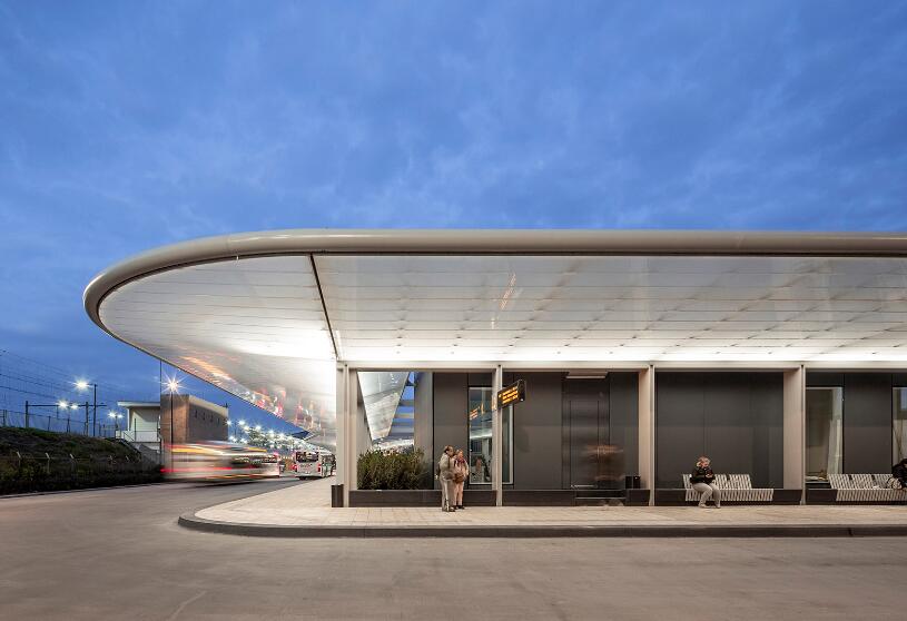 車(chē)站由一系列非常薄的柱子組成,頂部是一個(gè)簡(jiǎn)約的遮陽(yáng)蓬結(jié)構(gòu),形成了中心開(kāi)放,長(zhǎng)度超過(guò)160米的三角形流線。汽車(chē)停靠點(diǎn)沿著外側(cè)布置,共有6個(gè)上車(chē)點(diǎn)1個(gè)下車(chē)點(diǎn)。遮陽(yáng)篷結(jié)構(gòu)總體寬度為14到30米,結(jié)構(gòu)功能齊全與城市環(huán)境相協(xié)調(diào),寬闊的遮陽(yáng)蓬結(jié)構(gòu)完全覆蓋了整個(gè)公共汽車(chē)站臺(tái)和??科?chē)的一部分,因此旅客可以完全在遮陽(yáng)避雨的情況下上下車(chē)。