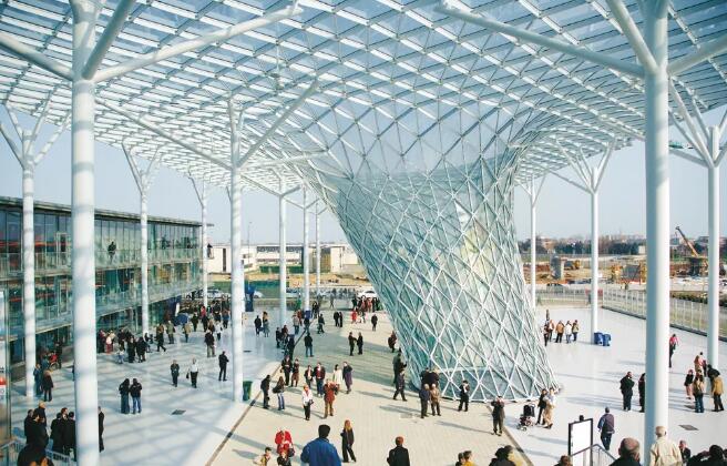 以上各種天幕結構均是支承在周邊建筑或樹形上的。除此以外,還有一種以天幕網格獨立或相對獨立支承的結構,其建筑形態(tài)往往呈現“喇叭形”。
