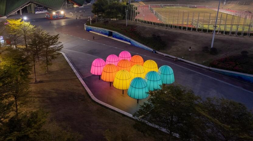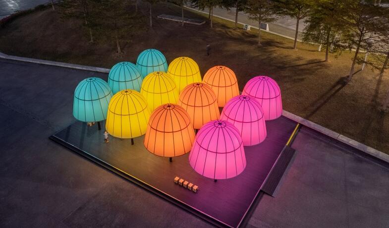 2021年深圳光影藝術季以“光遇未來”為總策展主題,希望光影藝術能融入城市生活,釋放城市公共空間的活力。“五色光亭”是位于龍崗展區(qū)大運中心的建筑景觀裝置作品。