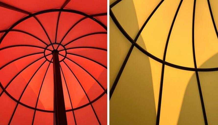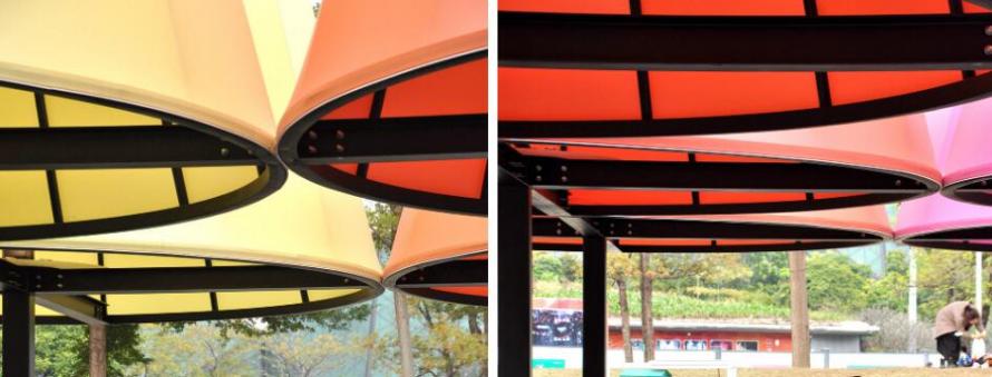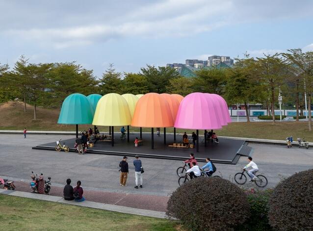 亭子穹頂部由彩色半透明的膜材料包裹,設計師希望材料能夠呈現(xiàn)類似紙張的質(zhì)感,光線可以穿透;其防水性也使亭子成為了雨天的臨時遮蔽場所。日間,透光材料遮蔽部分陽光,保證了亭下空間的舒適性;而在夜晚,點亮后的光亭多彩且柔和,成為城市晚間絕佳的公共活動空間。