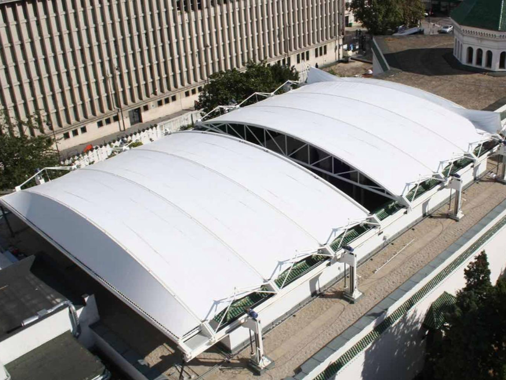 開合屋頂是一種較為新穎的建筑形式,它打破了傳統(tǒng)室內(nèi)空間與室外空間的界限,可以根據(jù)使用功能與天氣情況進(jìn)行室內(nèi)環(huán)境與室 外環(huán)境的轉(zhuǎn)換,滿足全天候的使用需求。帶有開合屋頂?shù)慕ㄖ?,可以進(jìn)行開啟、關(guān)閉操作。而對(duì)于開合屋頂來說,覆蓋材料的節(jié)能 和驅(qū)動(dòng)效率就十分關(guān)鍵和重要,在這方面,輕質(zhì)的膜材無疑是首選。
