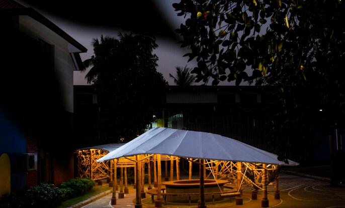 整個(gè)結(jié)構(gòu)由竹子和膜布建成,龍竹(Dendrocalamus giganteus )用于框架,銳藥竹(Oxytenanthera albocialiata Munro)用于弧形元素,而支撐和屋頂梁則采用泰竹(Thysostachys siamensis ), 屋頂覆蓋白色膜布,在∞形狀的兩個(gè)開口內(nèi)是場(chǎng)地的既有樹木和座位空間,供教師休息的同時(shí)能夠隨時(shí)視察孩子們的情況。
