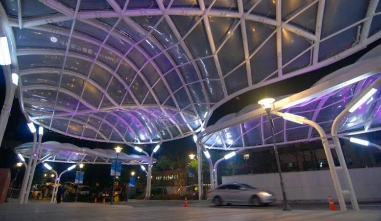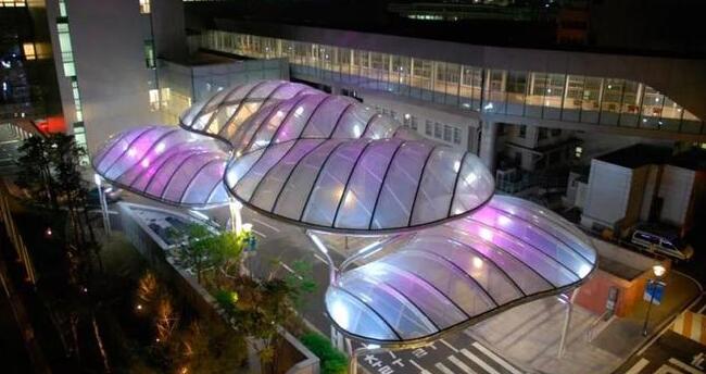 建筑入口材質(zhì)若采用ETFE膜材料,將不再局限于規(guī)則的形態(tài),可以營造出豐富的外觀形態(tài)效果,從而凸顯現(xiàn)代特色。另外,由于ETFE膜具有良好的透光性,夜晚借助照明系統(tǒng)和數(shù)控技術(shù),能使整個出入口如燈籠般通體透亮,藝術(shù)效果出眾,具有一定的時尚感,能很直觀的增加公眾的吸引力。