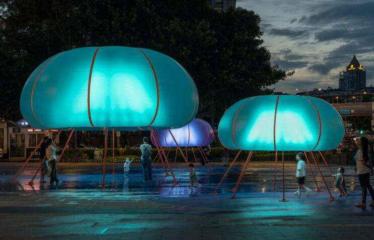 “光之浮想”的創(chuàng)作靈感來自遠古時期就已存在的海洋浮游生物——水母。受水母輕盈的傘狀形態(tài)及豐富色彩的啟發(fā),作品將目光投向“浮想”的自由空間與“光”的超現實體驗。