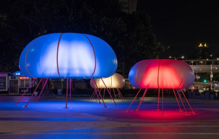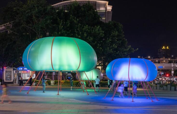 裝置的核心結構是一座直徑7米、高5.5米的大型光亭,構成地標式的視覺焦點。這座光亭提供了可仰望觀看的尺度,仿若深海中的巨型水母,使人們在光影間充分沉浸于幻想的世界,置于其中的聲音裝置也從聽覺層面疊加了更為豐富的體驗。