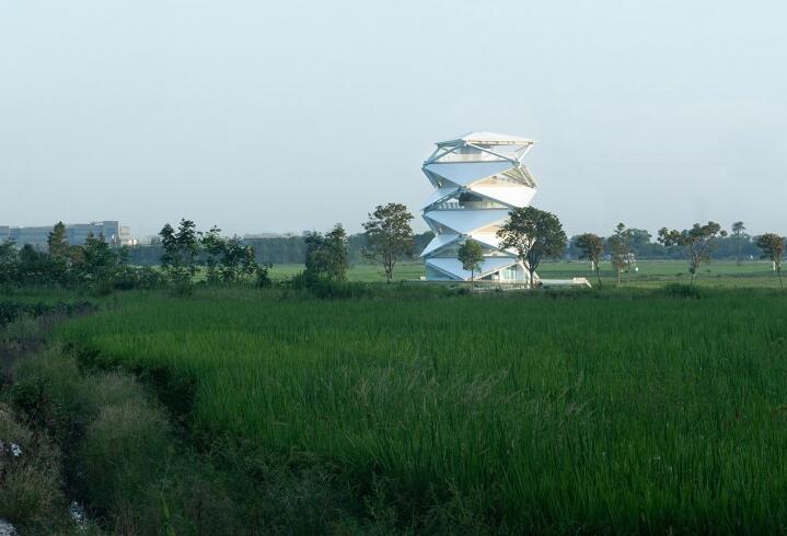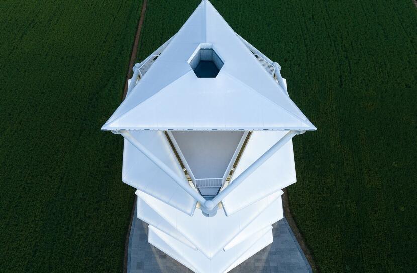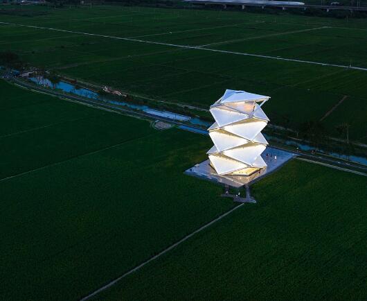 稻田上的燈塔作為寧波奉化區(qū)西塢街道 “萬畝方”項(xiàng)目最有標(biāo)志性的構(gòu)筑物,它的落成為當(dāng)?shù)氐泥l(xiāng)村提供了新的觀景點(diǎn)和社交聚集地。瞭望塔塔高23m,坐落于國家級現(xiàn)代農(nóng)業(yè)先行示范區(qū)高標(biāo)準(zhǔn)農(nóng)田的中心區(qū)域。它如同雕塑一般從稻田中螺旋升起,三角形元素和白色膜材定義了其簡潔的設(shè)計(jì)語言,在鄉(xiāng)村大地上賦予了其強(qiáng)烈的存在感。