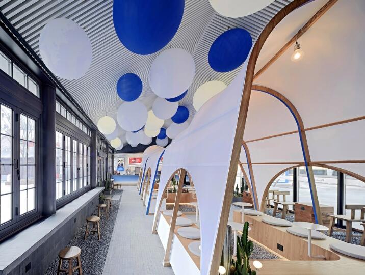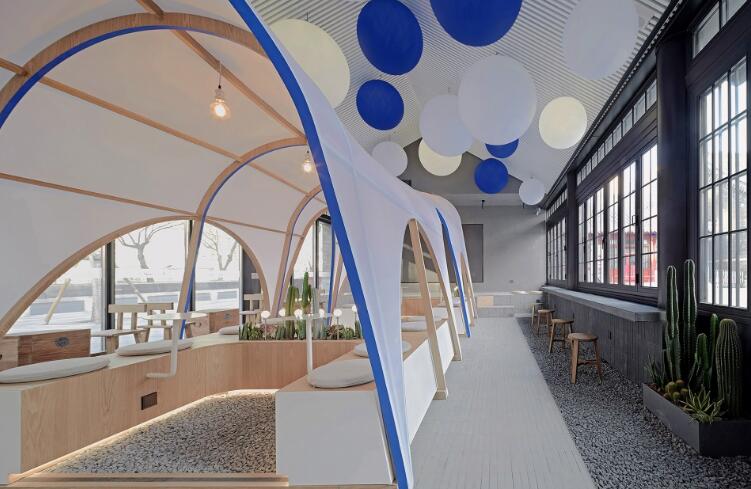 咖啡館位于蒙藏學(xué)校舊址入口南面,是西單北大街上蒙藏學(xué)校舊址傳統(tǒng)建筑群的一部分。咖啡館來(lái)源于帳篷的靈感,希望能在室內(nèi)營(yíng)造戶外公園般的輕松氛圍,在一個(gè)單一的狹長(zhǎng)空間里,用一種輕盈的方式重新定義空間。