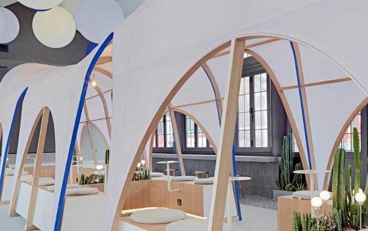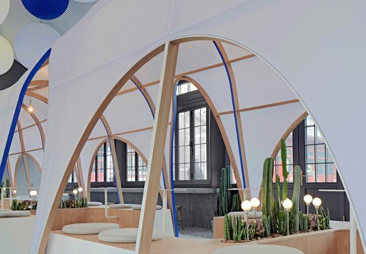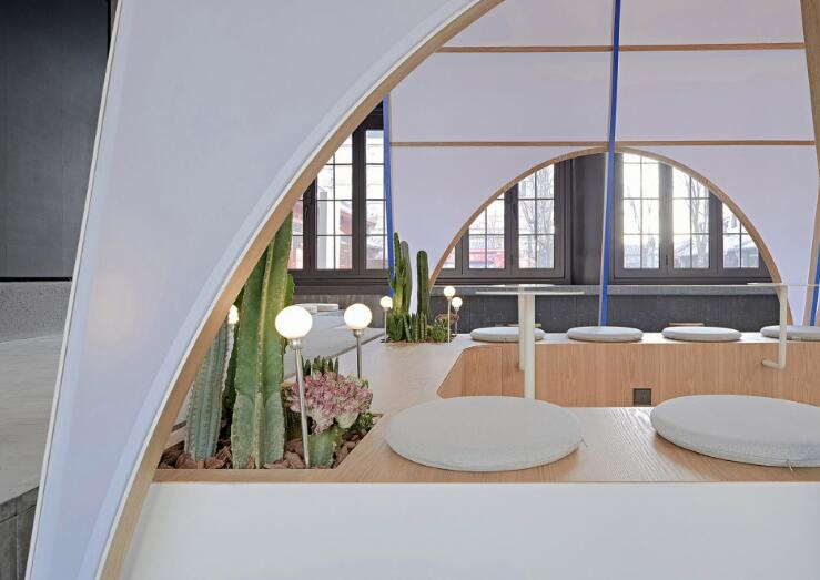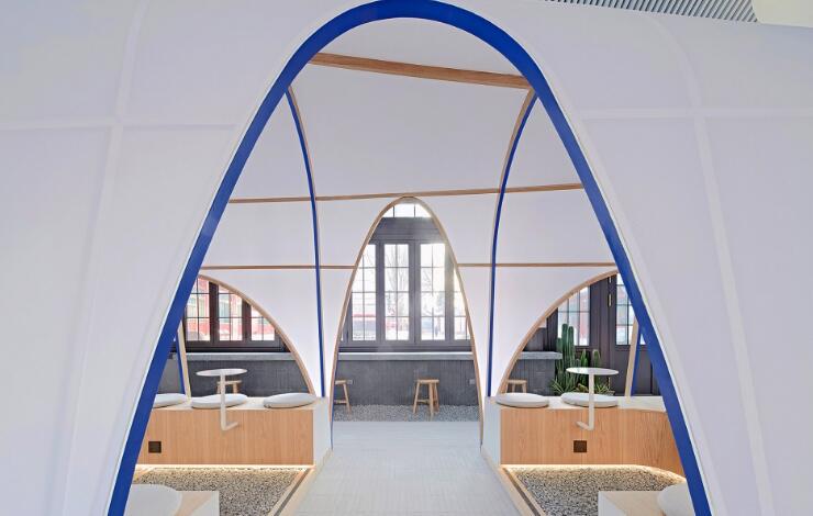 帳篷的最大特色在于其通透的弧線邊界,在視覺(jué)上具有獨(dú)特的視覺(jué)魅力,身處其中有一種置身戶外的松弛感。