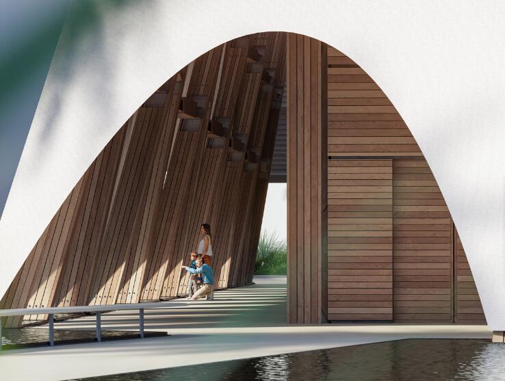 該展館的靈感源自卡塔爾獨(dú)桅帆船和傳統(tǒng)木工。展館由木結(jié)構(gòu)搭建,并覆蓋一層白色織物面紗,仿佛傳統(tǒng)帆船的風(fēng)帆,象征著兩國(guó)之間的歷史海上聯(lián)系。
