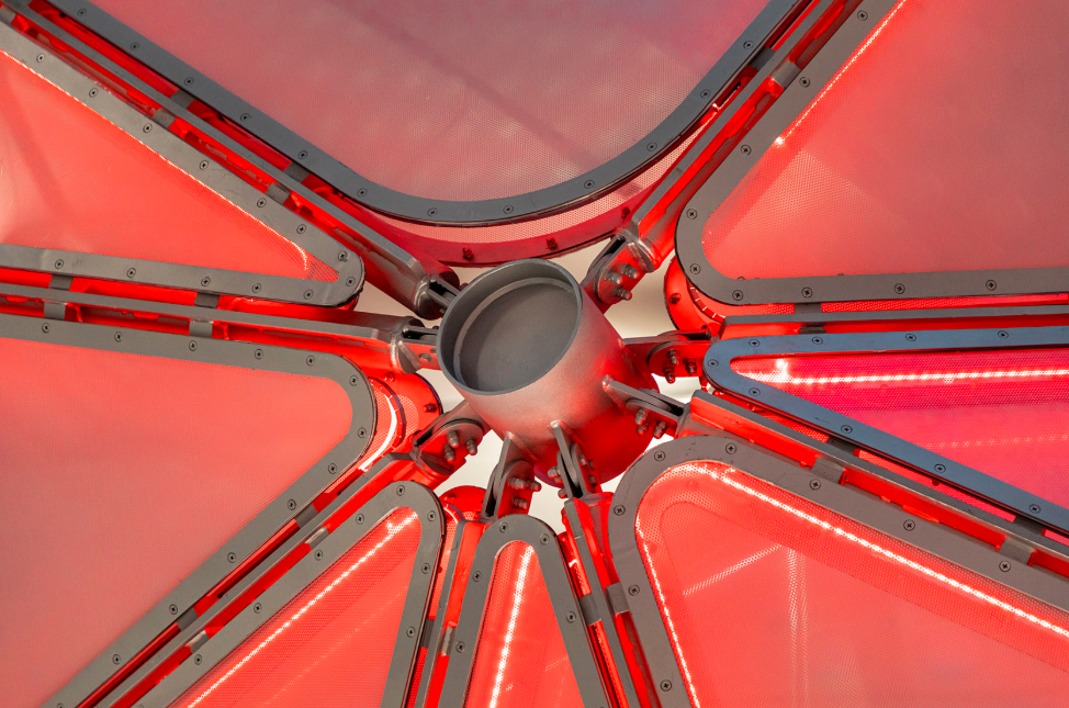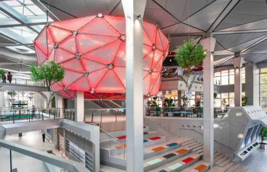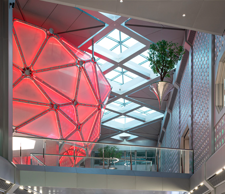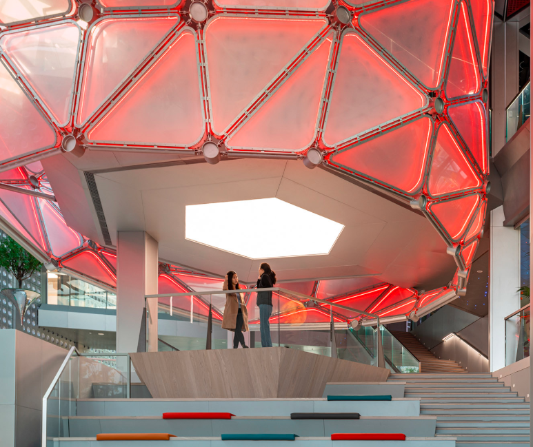 大燈籠以及下方的大臺階,構(gòu)成一個匯聚騰飛的整體,也是宇宙空間的能量交匯點。大燈籠采用雙層半透明ETFE膜材料,以現(xiàn)代手法重新演繹了中國傳統(tǒng)燈籠的形態(tài)。同時作為智慧建筑的一部分,燈籠能夠切換多種燈光效果,為空間增添趣味性和藝術(shù)感,并創(chuàng)造出獨特的視覺體驗,成為空間的點睛之筆。