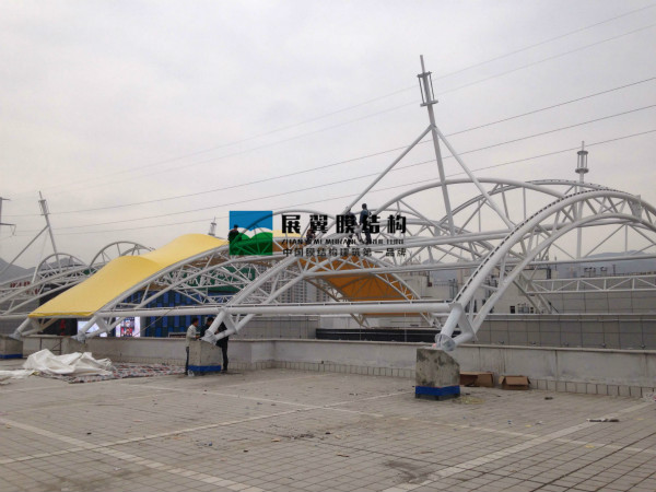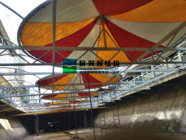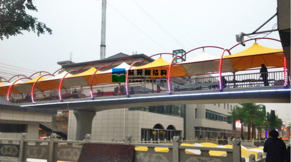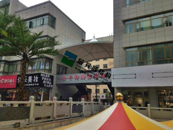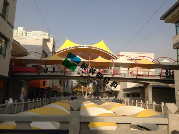 蘭州金牛街膜結(jié)構(gòu)工程全系列包括膜結(jié)構(gòu)天井、膜結(jié)構(gòu)屋頂遮陽(yáng)棚、膜結(jié)構(gòu)天橋通道遮陽(yáng)棚、啤酒屋膜結(jié)構(gòu)屋頂、特殊膜材玻璃房等等、工程全部采用彩色膜材搭配建造,造型設(shè)計(jì)別出心裁。這些張拉膜建筑不但具備強(qiáng)大的實(shí)用功能,同時(shí)也成為了商業(yè)街一大觀賞亮點(diǎn)。