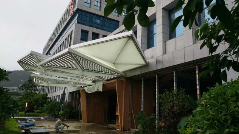 珠海保稅區(qū)大門膜結(jié)構(gòu)雨棚工程正在施工,雨棚造型為不規(guī)則幾何形狀,搭配高透光膜材,顯得時尚雅致。