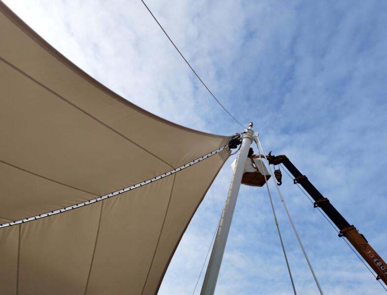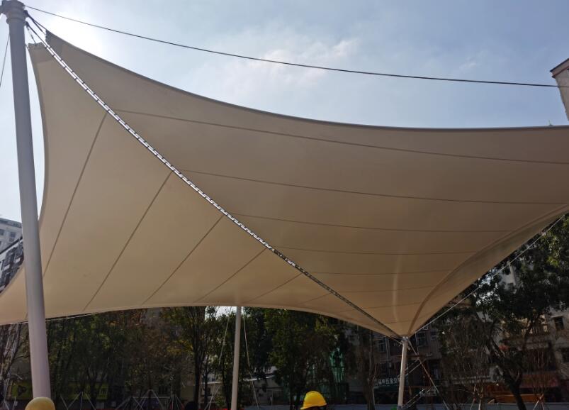 深圳寶安區(qū)廣場景觀膜結(jié)構(gòu)遮陽棚工程完工,該遮陽棚設(shè)計(jì)為經(jīng)典飛燕造型,整片張拉,簡潔大方,美觀兼實(shí)用,是居民休憩好去處。