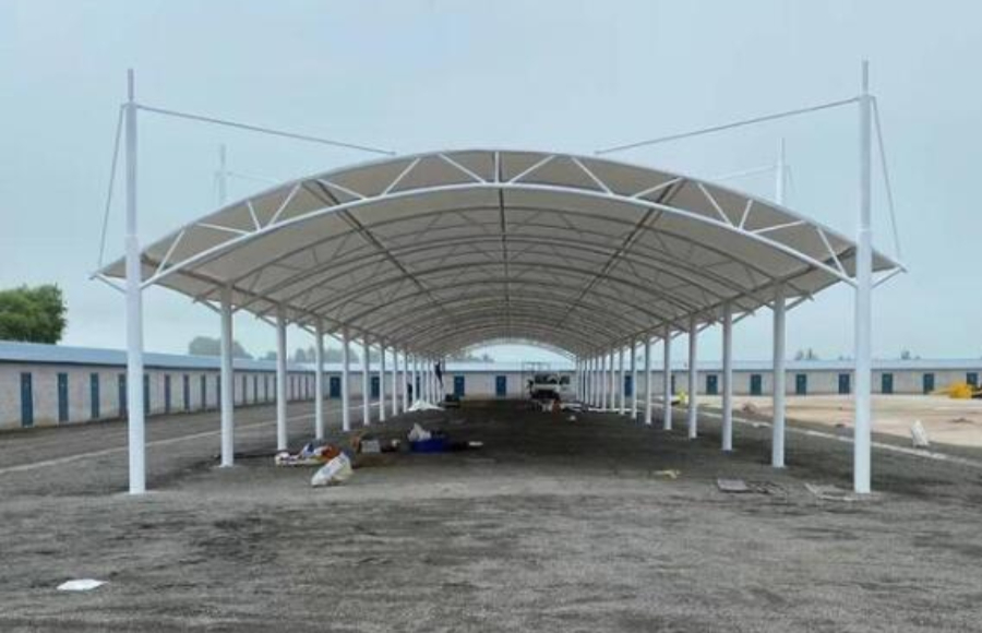 廣東茂名經(jīng)開(kāi)區(qū)廠房張拉膜結(jié)構(gòu)停車(chē)棚工程基本完工,車(chē)棚設(shè)計(jì)為拱形屋面式棚頂,鋼結(jié)構(gòu)支撐。工程現(xiàn)進(jìn)行最后調(diào)節(jié)及清潔工作。