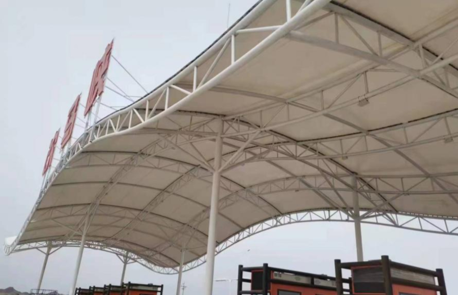 G215線馬鬃山至橋?yàn)彻凤嬹R峽收費(fèi)站大棚張拉膜結(jié)構(gòu)工程基本完工,工程采用進(jìn)口白色PTFE膜材,膜材覆蓋面積近2000㎡。
