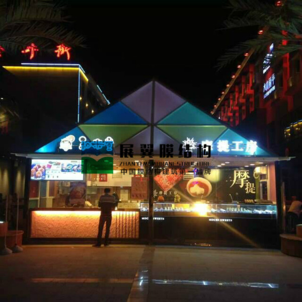 蘭州金牛街膜結構工程全系列包括膜結構天井、膜結構屋頂遮陽棚、膜結構天橋通道遮陽棚、啤酒屋膜結構屋頂、特殊膜材玻璃房等等、工程全部采用彩色膜材搭配建造,造型設計別出心裁。這些張拉膜建筑不但具備強大的實用功能,同時也成為了商業(yè)街一大觀賞亮點。