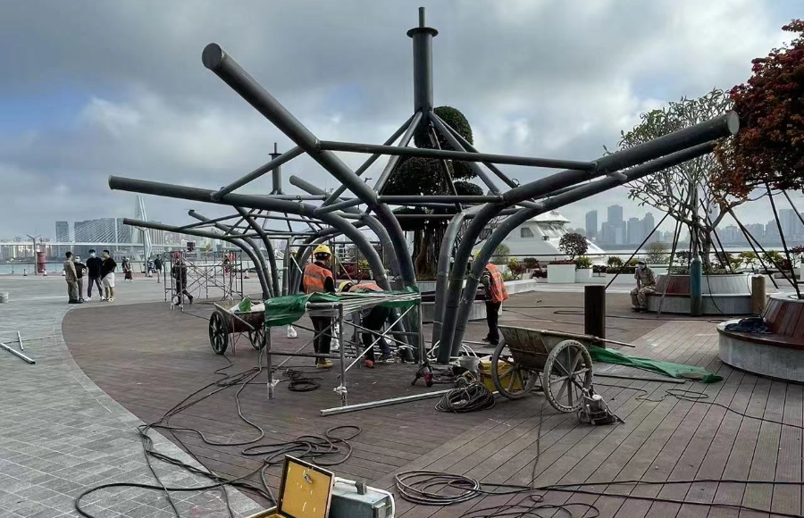 ??跒硰V場(chǎng)景觀膜結(jié)構(gòu)工程進(jìn)入施工階段,目前施工材料均已進(jìn)場(chǎng),鋼結(jié)構(gòu)正在安裝當(dāng)中,完成后即進(jìn)行膜材安裝。