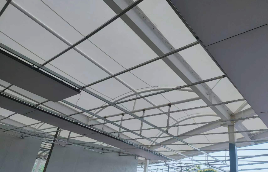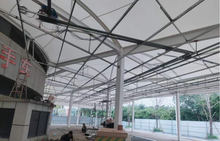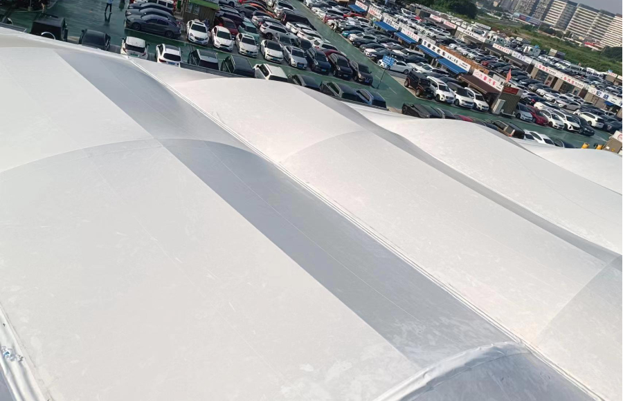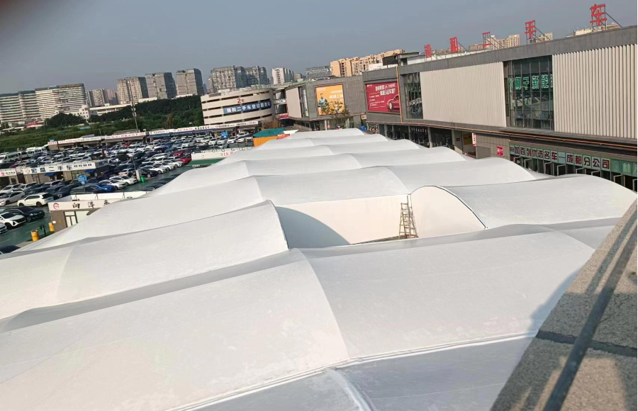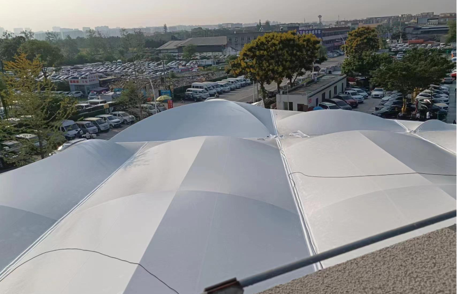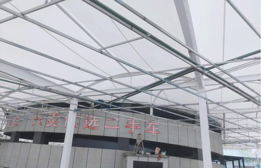 成都市雙流區(qū)二手車市場張拉膜結構大棚工程正在施工,現(xiàn)場看到錯落有致的鋼構上方膜材已覆蓋張拉成形,高低起伏的拱形屋頂顯得美觀又時尚,底下空間敞亮,整個結構穩(wěn)固而結實。