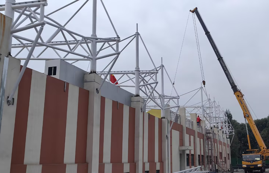 青海海東三中張拉膜結(jié)構(gòu)工程正在施工,工程體量包含風(fēng)雨操場(chǎng)看臺(tái)及主席臺(tái)罩棚,目前已完成鋼結(jié)構(gòu)吊裝工作,接下來(lái)進(jìn)行膜材的覆蓋。