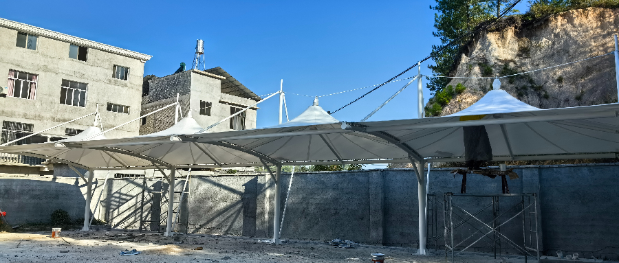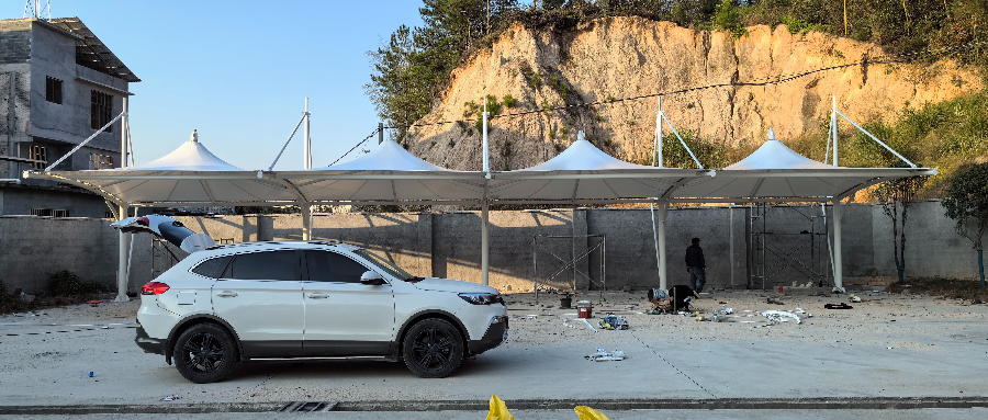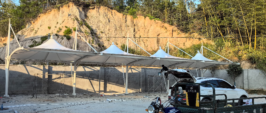 湖北張拉膜停車棚工程近日完工,車棚設計為尖頂單邊懸挑造型,結(jié)構(gòu)穩(wěn)固,美觀大方。