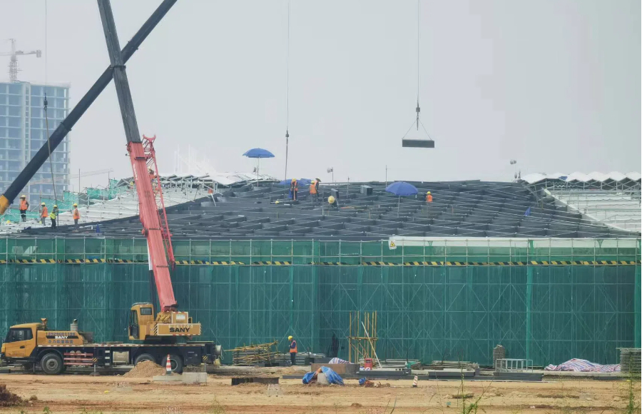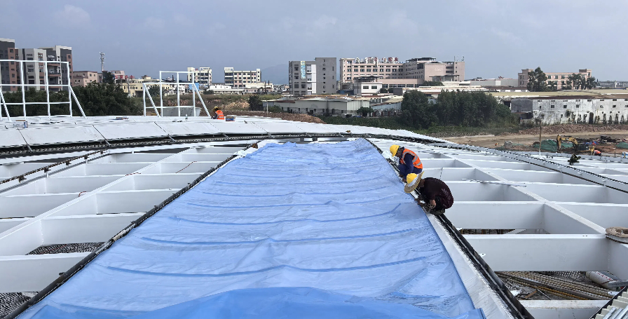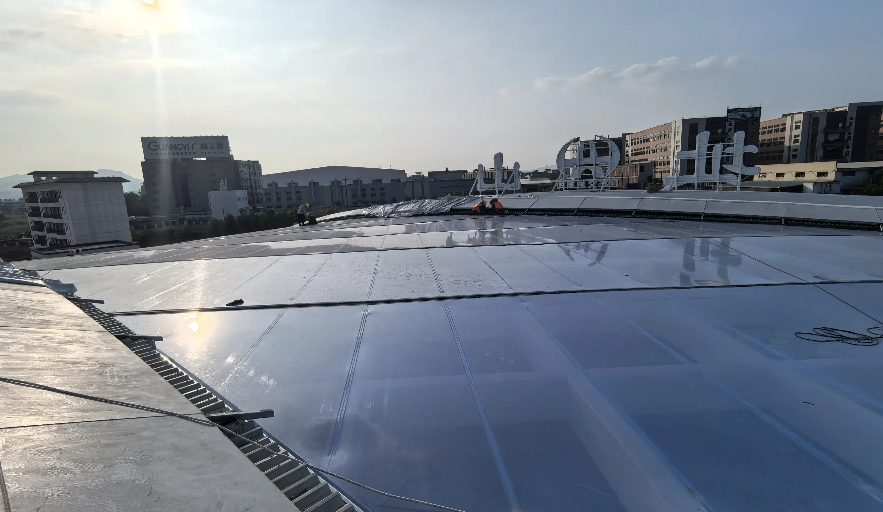 江門址山服務(wù)區(qū)ETFE膜結(jié)構(gòu)屋頂項(xiàng)目進(jìn)入緊張的施工階段,目前鋼結(jié)構(gòu)安裝完成,正在進(jìn)行膜材的安裝,工程面積逾3000平方米。