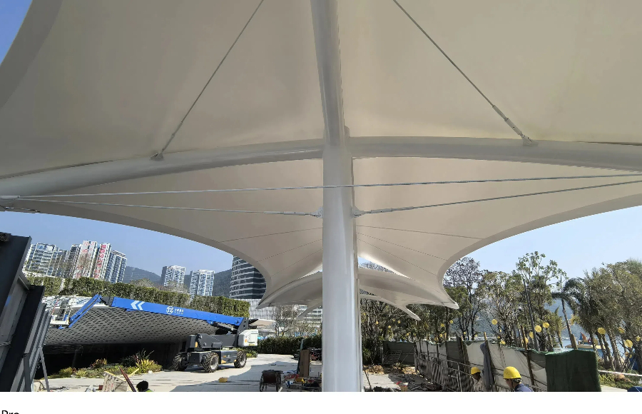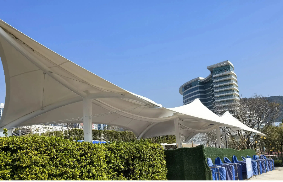 小梅沙海濱旅游中心出入口張拉膜頂棚工程正在施工當(dāng)中,現(xiàn)場(chǎng)看到設(shè)計(jì)為白色“飛燕”造型的頂棚已安裝完成,曲線邊界顯得張力十足,底下由鋼結(jié)構(gòu)及鋼索支撐,結(jié)構(gòu)穩(wěn)固耐用,適合海濱等場(chǎng)地。