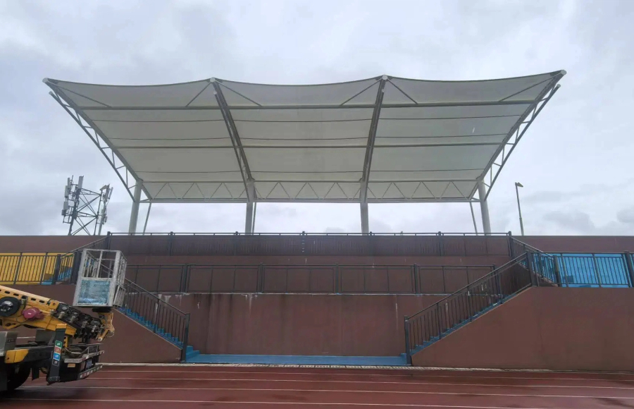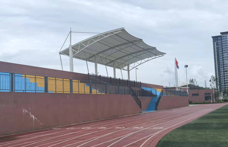 長(zhǎng)沙翰林府明德智谷學(xué)校膜結(jié)構(gòu)看臺(tái)工程近日基本完工,看臺(tái)設(shè)計(jì)為懸挑張拉結(jié)構(gòu)。