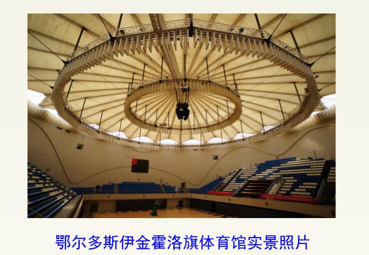 鄂爾多斯伊金霍洛旗體育館索穹頂(雙層PTFE夾氣凝膠保溫層+ETFE,2011年竣工,8000m2)