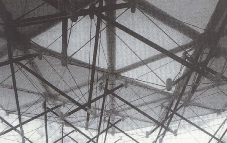 20世紀(jì)50年代,美國(guó)建筑大師富勒受自然現(xiàn)象啟發(fā),構(gòu)筑了富勒球結(jié)構(gòu),他將這種結(jié)構(gòu)解釋為“壓的孤島存在于拉的海洋之中”,即由不連續(xù)的系列壓桿與連續(xù)的系列拉索構(gòu)成整體空間球結(jié)構(gòu)。美國(guó)著名結(jié)構(gòu)專家蓋格認(rèn)為富勒球?qū)儆趶埩Y(jié)構(gòu)體系,體系中的拉索若無松弛則為失穩(wěn)之慮,蓋格依此提出了索膜穹頂空間結(jié)構(gòu)體系。索膜穹頂結(jié)構(gòu)一經(jīng)出現(xiàn),立即為國(guó)際空間結(jié)構(gòu)工程所矚目。