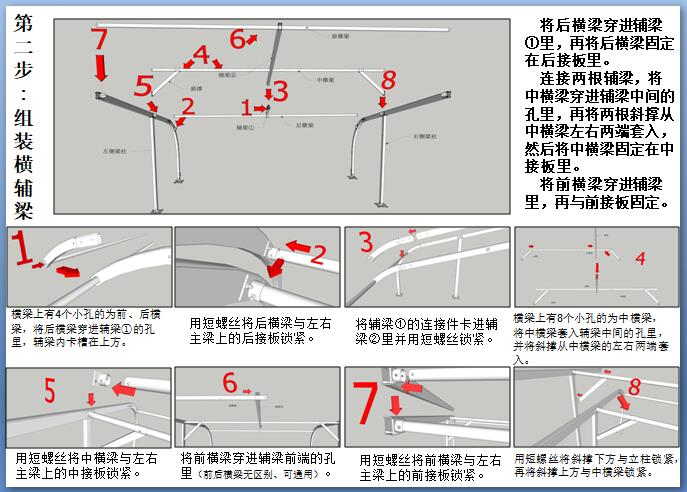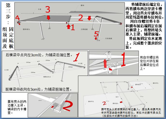 膜結(jié)構(gòu)停車(chē)棚安裝步驟說(shuō)明如下: