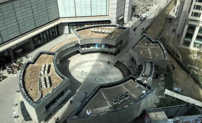 北京華貿(mào)中心是由寫字樓、商城、酒店公寓等組成的大規(guī)模商務建筑群,其間為華貿(mào)廣場,后由于使用功能要求在廣場上加建頂蓋,如圖1所示。由于周邊結(jié)構(gòu)已經(jīng)建成,故甲方希望加建的頂蓋,自重要輕、支座反力要小、施工要快、造型要新穎。因此經(jīng)過多方案比較,最終選定了索穹頂結(jié)構(gòu)形式。