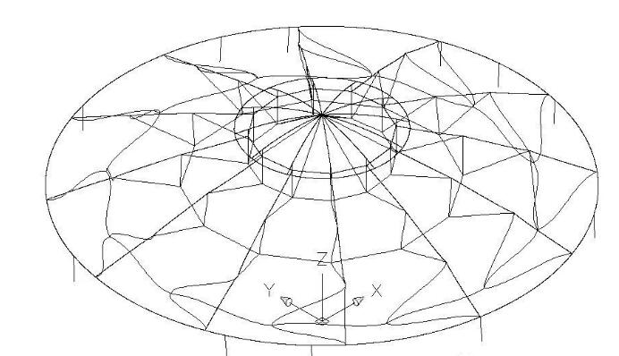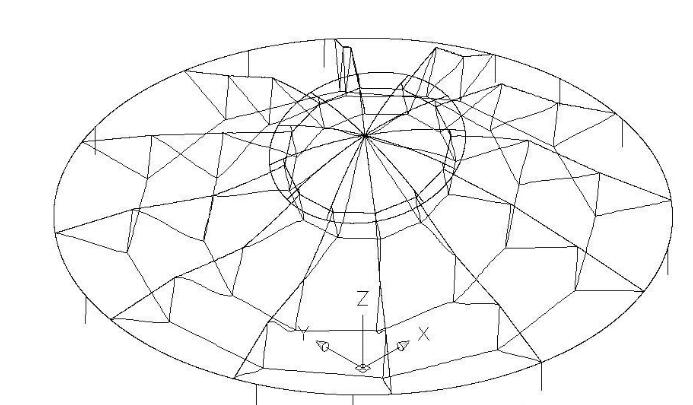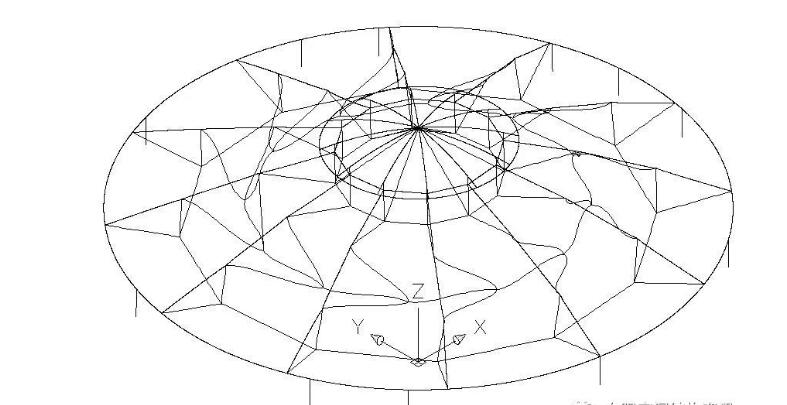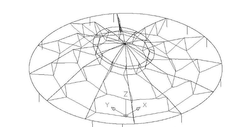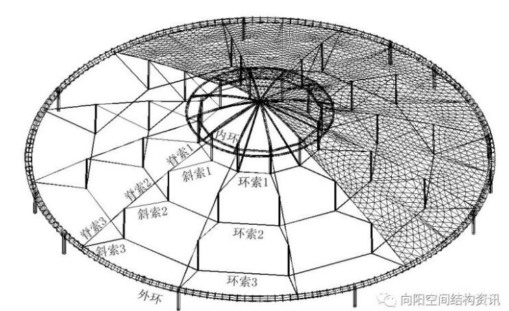 定義一下結(jié)構(gòu)各構(gòu)件的名稱,分別為內(nèi)環(huán)、外環(huán)、脊索1~3、環(huán)索1~3、斜索1~3、撐桿1~3,如圖2所示。邊界條件是確定的,即外環(huán)直徑33.4米、內(nèi)環(huán)直徑9米。而穹頂?shù)氖父?、每根索的預拉力是未知的。初始形態(tài)設計就是要尋求滿足邊界條件、在合理的預拉力分布下,結(jié)構(gòu)的外形包括矢高。所謂合理的預拉力,就是預拉力不能太小也不能太大。太小,剛度不足,在荷載作用下結(jié)構(gòu)變形不能滿足規(guī)范要求;太大,桿件強度又不能滿足規(guī)范要求,無休止的加大截面又會造成用鋼量增加。因此,這是一個假定預拉力分布、找形、受荷計算、調(diào)整預拉力分布、再找形、再受荷計算,直至循環(huán)到合理的預拉力分布及其對應的形狀的過程。