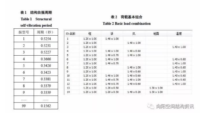 然后對結(jié)構(gòu)進行各種荷載及作用組合下的計算分析,基本組合如表2所示。經(jīng)過對結(jié)構(gòu)的非線性分析,結(jié)構(gòu)中心點在恒荷載與活荷載標準值作用下?lián)隙葹?06mm,跨度為33.4m,106/33400=1/315,滿足規(guī)范中不大于1/250容許撓度值的要求[4]。