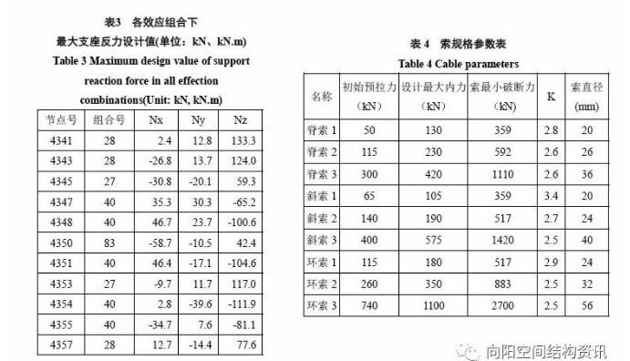 當然,如果設計師比較有經(jīng)驗,初步假定的預拉力比較合理,循環(huán)迭代3-4步即可得到滿意的結(jié)果。本文的初始形態(tài)設計的結(jié)果如圖3所示,矢跨比1/8。此時,膜的初始預張力2kN/m,每種索的預拉力參見表4。鋼結(jié)構(gòu)桿件截面,外環(huán)為Φ500×12,與索相交區(qū)域為Φ500×18,內(nèi)環(huán)為Φ159×6,撐桿為Φ102×4,支座為Φ219×10,材質(zhì)為Q345B。