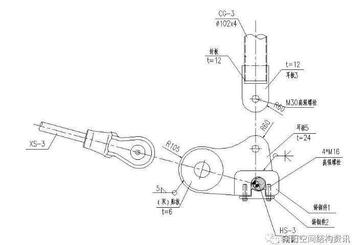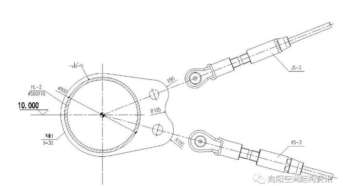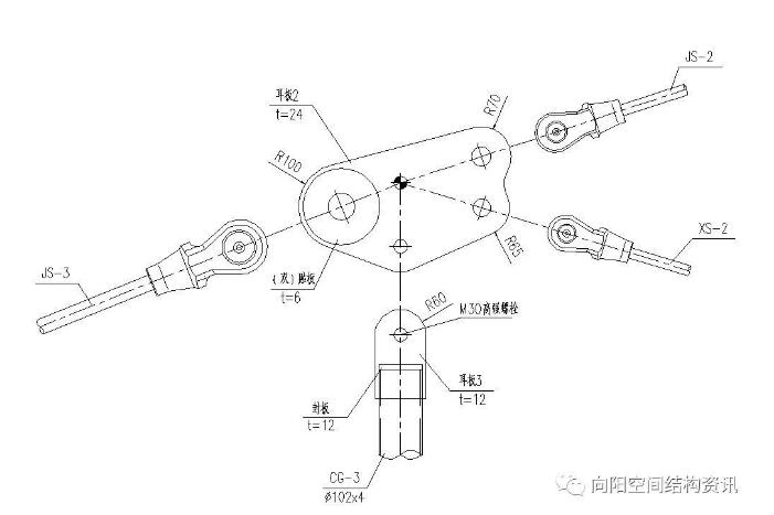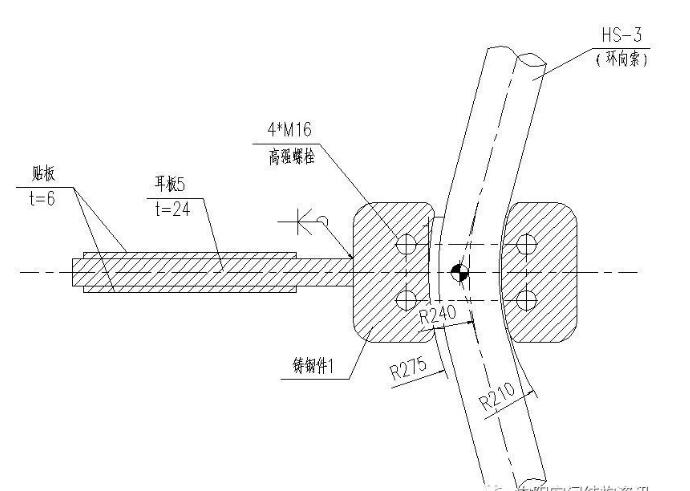 索穹頂?shù)墓?jié)點設計,既要保證符合計算假定,又要便于施工張拉,因此正確合理的節(jié)點設計是關鍵的一步。以下例舉幾處索穹頂膜結(jié)構(gòu)的特有節(jié)點。如圖8所示,為脊索、斜索匯交與外環(huán)梁處的節(jié)點。圖9所示為撐桿下端與脊索的節(jié)點。圖10所示為撐桿上端與斜索及環(huán)索的節(jié)點。圖11為實際索節(jié)點照片。