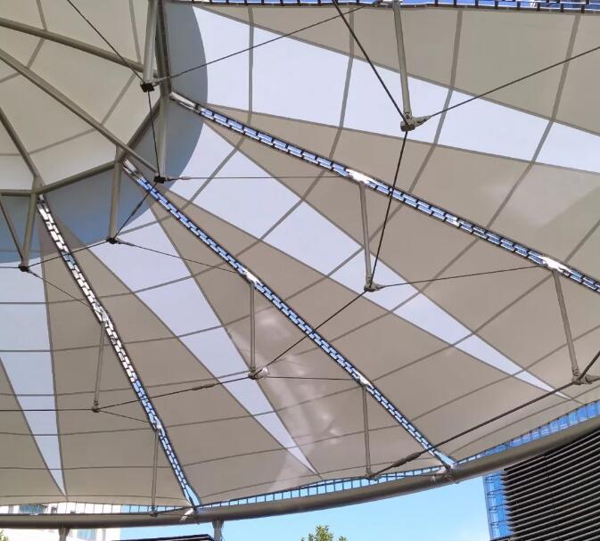 膜面與脊索的連接節(jié)點如圖12所示。另外我們知道,膜結(jié)構(gòu)還需要進行裁剪設計,即用平面的、有一定幅寬的膜材,通過裁剪,拼接出曲面的膜單元。一般來講,拼接縫的布置首要考慮的是膜材的利用率,盡量的減少裁剪損耗。本項目在兼顧利用率的同時,更注重的是美觀。根據(jù)索的布置特點,如圖13所示將拼接縫設計為輻射狀的環(huán)形,實際效果圖14所示。